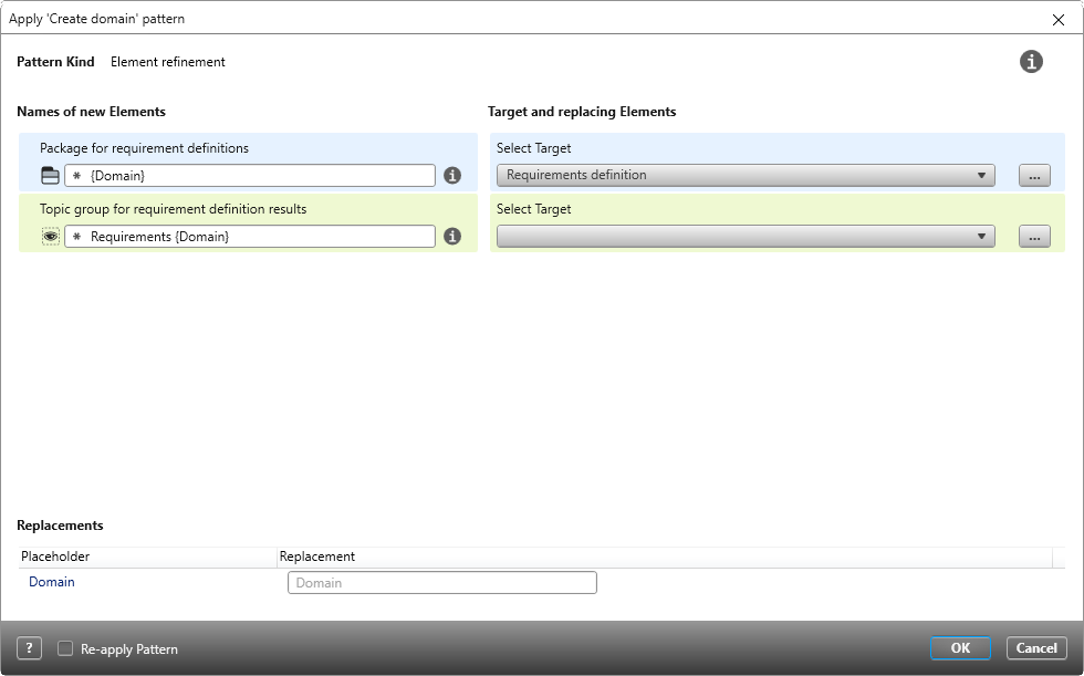 If placeholders have been specified in the pattern, they will be listed here. Enter the name to replace the placeholder here. You do not need to replace the placeholder displayed under Names of new Elements.