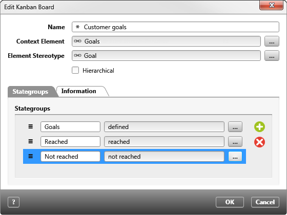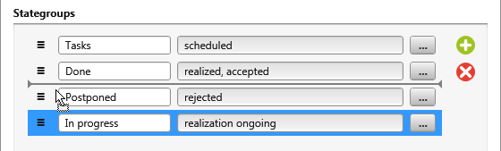 Via the plus button you create columns which are displayed in the Kanban Board. In the first field you enter the column name / ranges and via the […] button you enter the states which are to be considered in the column.