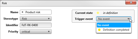 If a state machine has been created for a stereotype, you can change the state in the editing dialog of an element. The state change is performed manually or automatically.
