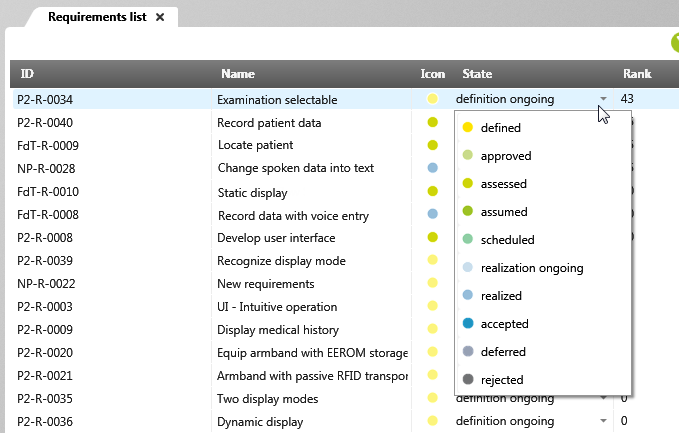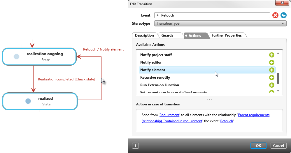 For elements that are related to other elements, you can define an action with an event in the state machine that then automatically triggers a state change. For example, you can define that refined requirements change to the realized state as soon as the higher-level requirement changes to the accepted state. You can also define a task that changes the state of items at a certain point in time.
