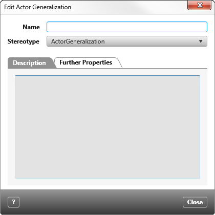 Stereotype When creating the relationship, the standard stereotype ActorGeneralization is preselected. If you have extended the stereotype, you can change the preselected stereotype by using the dropdown list. The stereotype controls whether and which user-defined properties are displayed in the tab Further Properties.