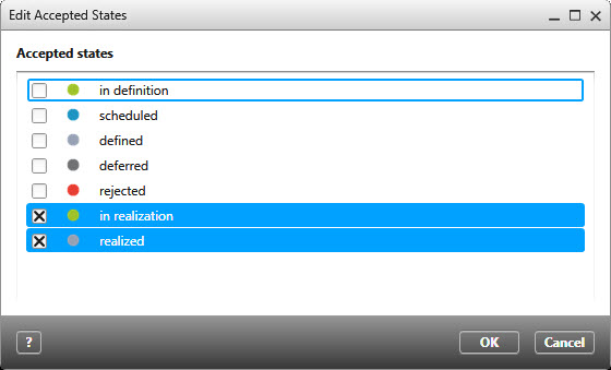 If you have assigned different input or output products, such as documents, requirements, etc. to an activity, you can determine which states the products must have in order for the activity to change state.