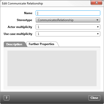 Stereotype When creating the relationship, the standard stereotype CommunicatesRelationship is preselected. If you have extended the stereotype, you can change the preselected stereotype by using the dropdown list. The stereotype controls whether and which user-defined properties are displayed in the tab Further Properties.