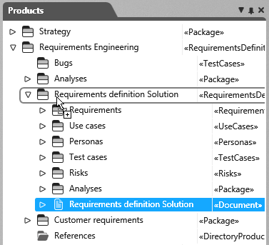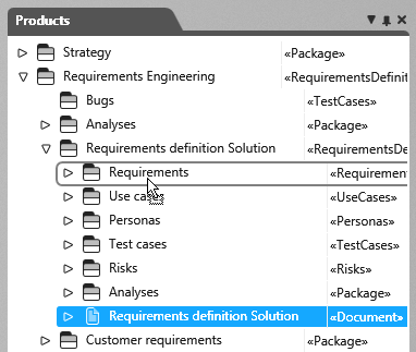 You create new elements in the Products window using the context menu of a package that offers context-related menu commands for creating various elements. You can also use diagrams to create new elements. These are always stored in the package in which the diagram is located.