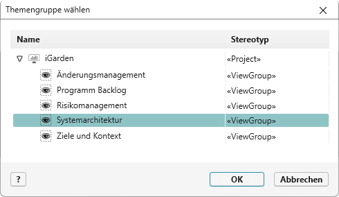 Klicken Sie eine Themengruppe oder das Projekt/ Organisation an und bestätigen mit OK.