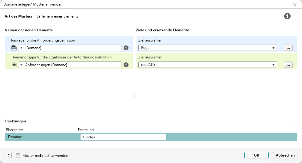 - Legen Sie über die Schaltfläche […] fest, wo die durch die Muster erzeugten Elemente abgelegt werden sollen. Bei Verfeinerungsmuster sind Ablageorte oft vorausgewählt. Außerdem können Sie die Namen der Musterelemente ändern, indem Sie direkt in das Namensfeld klicken. Wenn Platzhalter definiert sind, können sie auch das untere Feld Ersetzungen nutzen, um die neuen Namen anzugeben.