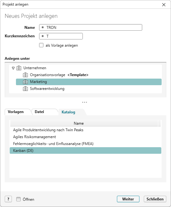 ​Projekte werden im Userboard über das Kontextspezifische Menü oder in einer Organisation angelegt. Als Vorlage verwenden Sie eine der mitgelieferten Projektvorlagen oder Sie importieren aus dem Projektkatalog eine geeignete Vorlage.
