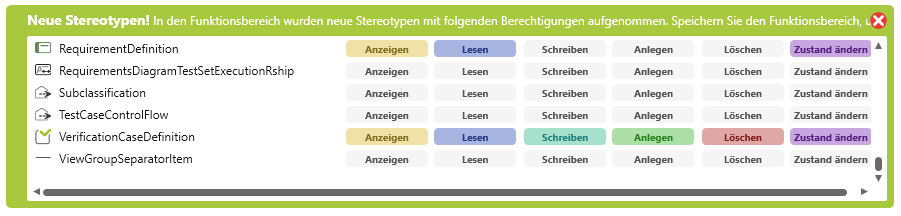 In dieser Sicht definieren Sie für ausgewählte Elementtypen (Stereotypen), welche Berechtigungen und  Kontextmenübefehle in einem Funktionsbereich erlaubt sein sollen. So können Sie gezielt festlegen, welche Aktionen Anwender in bestimmten Bereichen ausführen dürfen.
