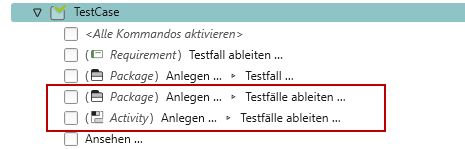 Beispiel: Für den Stereotyp TestCase finden Sie die zwei Befehle Anlegen → Testfälle ableiten. Ein Befehl wird Ihnen auf einem Package angezeigt und der andere auf einer Aktivität.