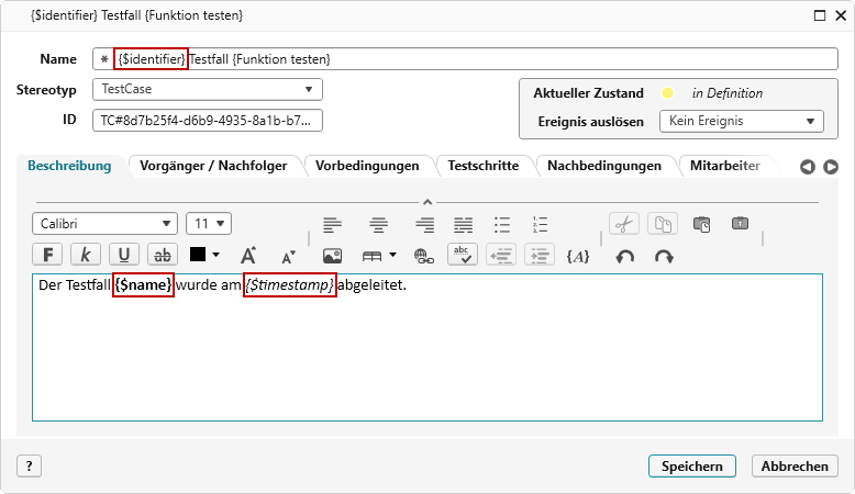 Selbstdefinierte Platzhalter geben Sie im Namen des Elements oder im Beschreibungsfeld und immer in geschweiften Klammern ein.