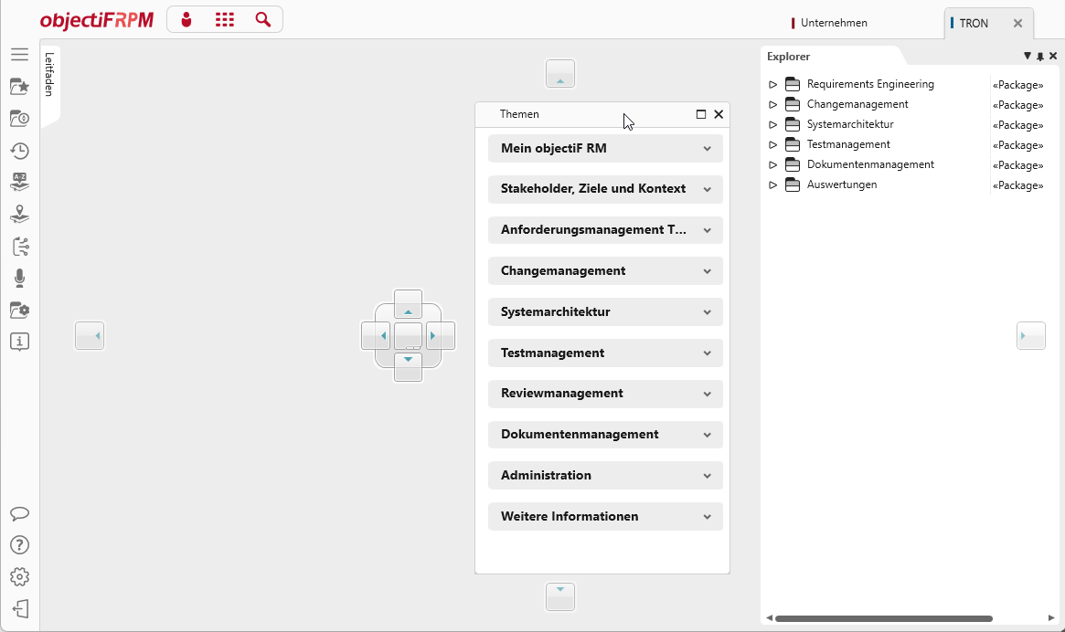 Der Workspace bezeichnet die zentrale Arbeitsoberfläche und ist im Wesentlichen einheitlich. Hier modellieren Sie Diagramme, erzeugen und bearbeiten Elemente, werten Ihr Projekt aus oder generieren Dokumente etc. Kurz gesagt: Im Workspace managen Sie Ihre Projekte und verwalten Ihre Organisationen.