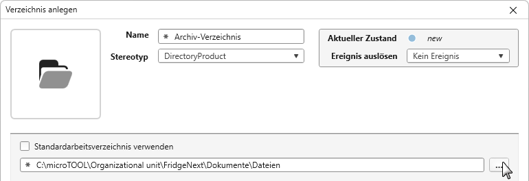 Das Arbeitsverzeichnis ist der Ordner, in dem Dateien wie Bilder, PDF-Dokumente oder andere Unterlagen gespeichert werden, wenn Sie den Befehl Ausleihen oder Letzte Version holen auf eine Datei oder ein Verzeichnis anwenden. Standardmäßig befindet sich dieses Verzeichnis unter C:\microTOOL\objectiF RPM\[Organisationsname\Projektname\…].