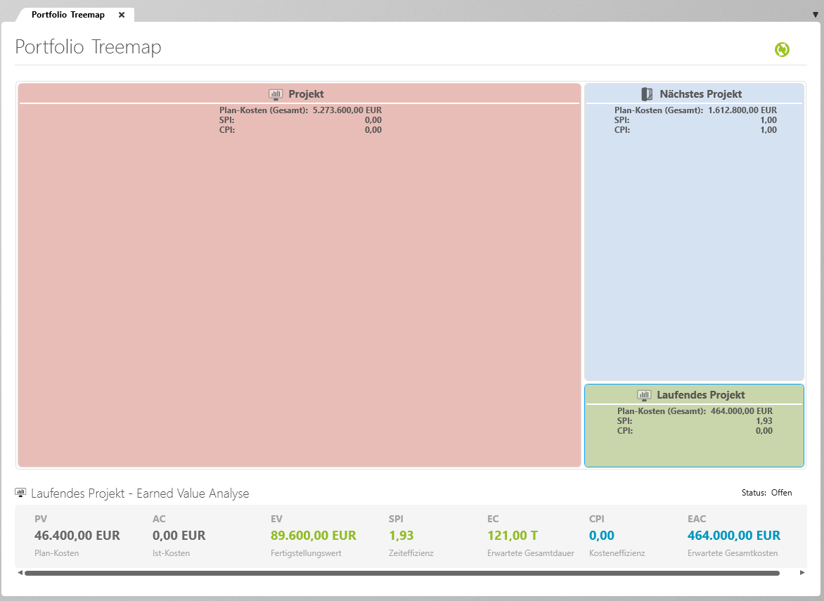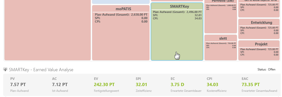 Im unteren Bereich sehen Sie zum aktuell ausgewählten Value Stream die Werte der Earned Value Analyse und den eingestellten Status. Dazu müssen Sie nur ein Projekt (Rechteck) anklicken.