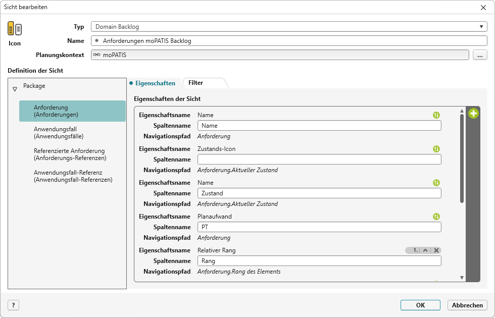 Befinden Sie sich stattdessen in einer Backlogsicht, legen Sie auf dieser Registerkarte die Packages fest, deren Inhalte in der Sicht angezeigt werden sollen.