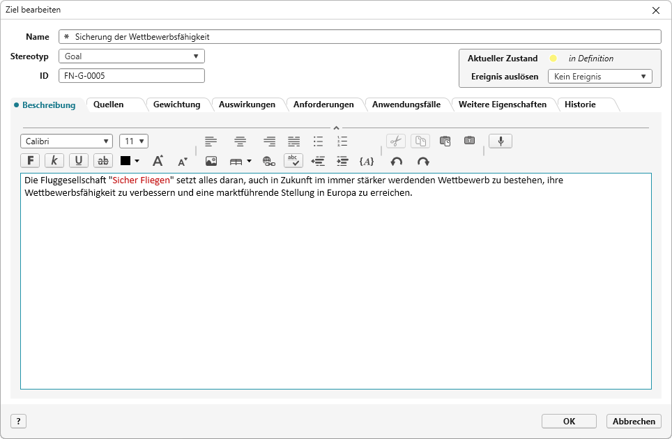 - Im Bearbeitungsdialog eines Ziels können Sie alle Informationen festhalten. Geben Sie dem Ziel einen Namen, geben einen Gewichtung ein oder wählen unter Quellen einen Stakeholder aus, damit Sie später zurückverfolgen können, von wem das Ziel kam.