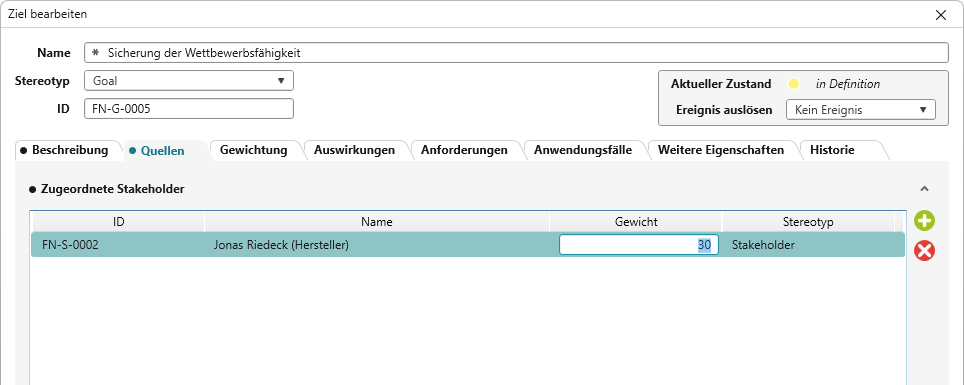 - Sind bereits Stakeholder zugeordnet, klicken Sie in die Spalte Gewicht und geben einen beliebigen Wert ein.